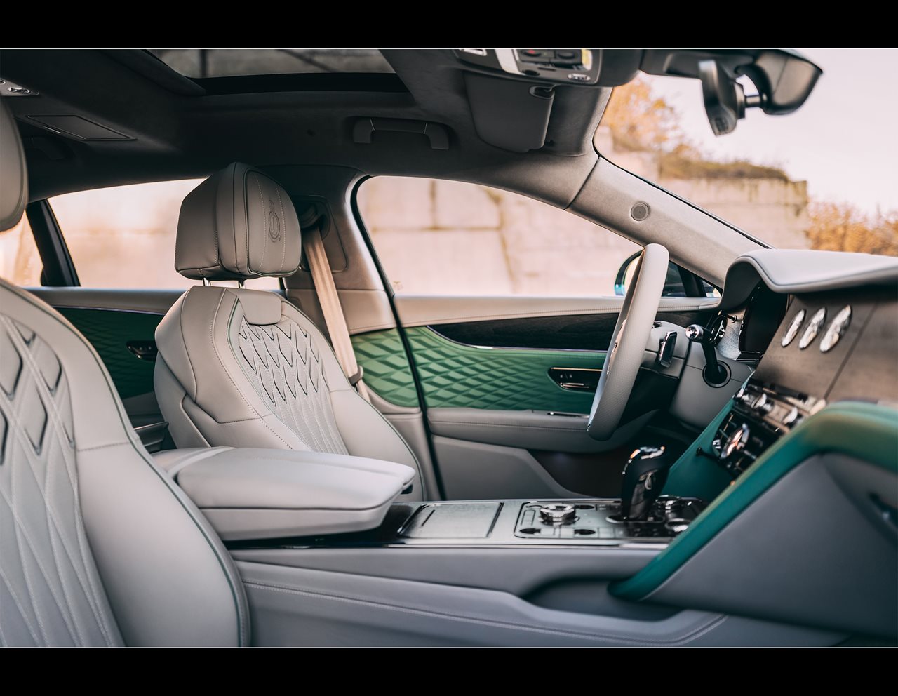 As with the exterior, the interior’s design palette is a tour-de-force of restrained yet harmonising colours and finishes. A bespoke colour split features Gondola Green as the main hide and Gravity Grey as the secondary hide, with Beluga as a third, accent colour. The Czech Collection Flying Spur is specified in four-seat configuration with a full-length centre console dividing the cabin. All veneered surfaces, including console, waistrails and fascia, are finished in open pore black stained Crown Cut Walnut. The headrests feature laser-etched Squadron 313 insignia front and rear, while the bespoke treadplates feature the Spitfire profile together with the squadron motto ‘One hawk chases many crows’.