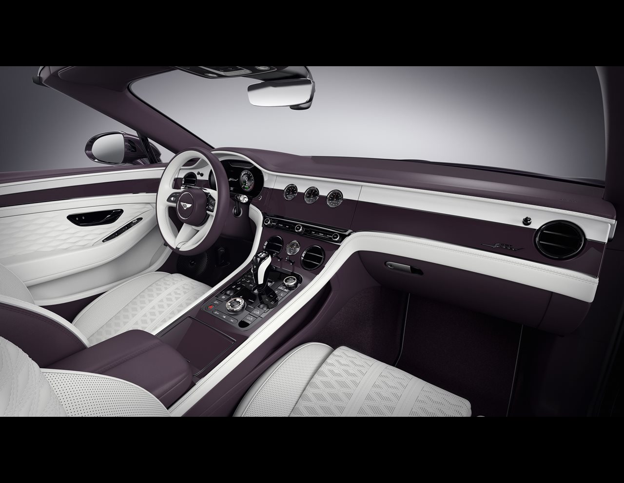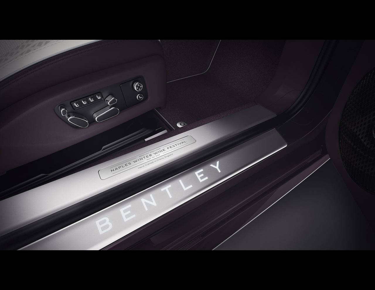 The GTC features a striking Damson exterior paint paired with a Dark Grey Metallic fabric roof, while the Light Grey interior roof complements the White main hide and Damson secondary hide, accented with silver seat piping. Adding to its exclusivity are personalized Naples Winter Wine Festival treadplates, blackline and touring specifications, LED welcome lights, and a Moonbeam-painted pinstripe around the exterior. The GTC also features a unique piano white and Damson-painted veneer, a specification exclusive to Mulliner, making this vehicle truly one of a kind.