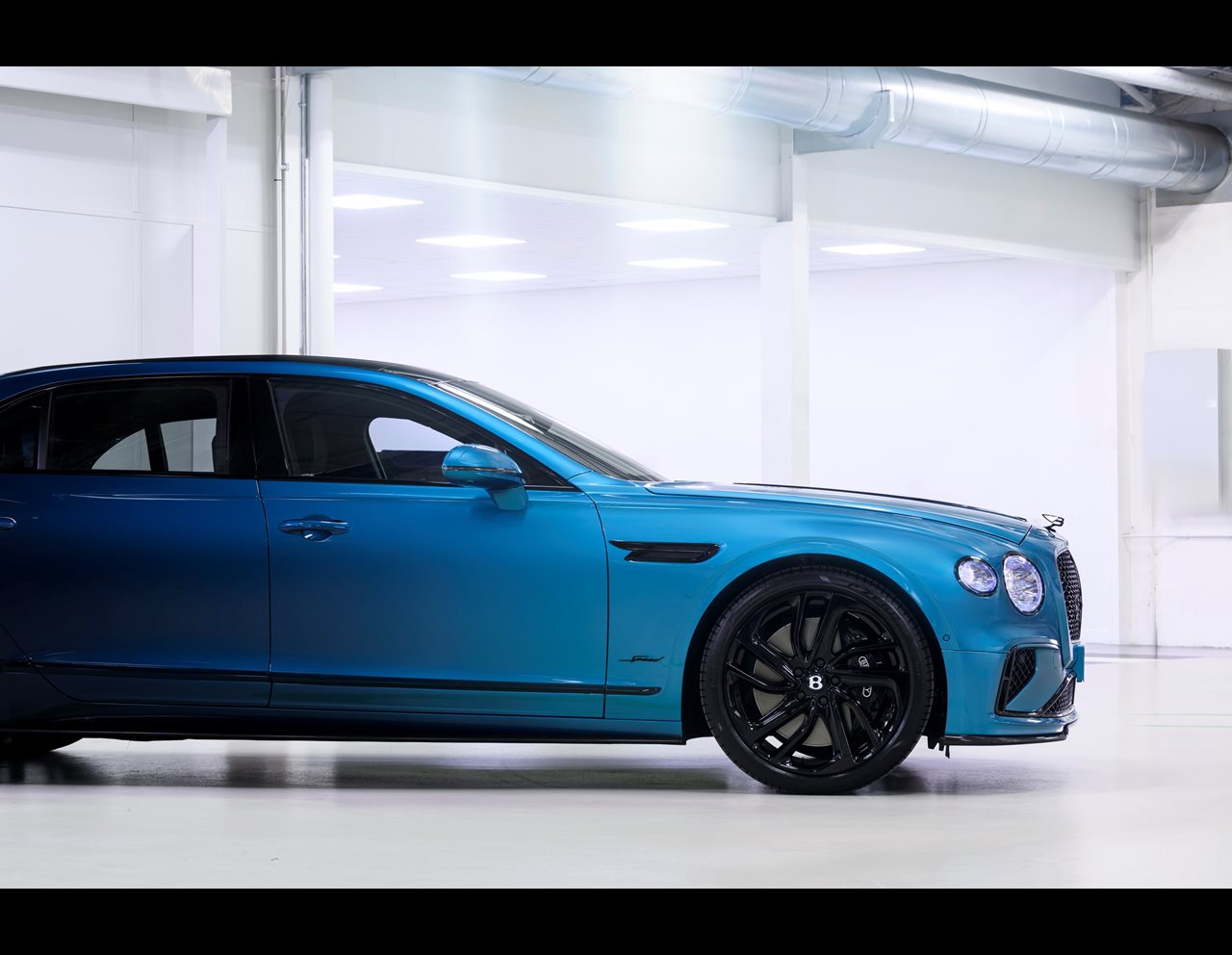 The new Flying Spur’s paint transitions from vibrant Topaz Blue at the front, to the darker Windsor Blue rear, with the fade occurring through the mid-section of the car across the doors, sills and roof. The process takes nearly 60 hours for two highly skilled paint technicians to complete, and starts with the spraying of the individual colours at the front and rear of the body. The transition happens across the centre of the car and is applied in stages, using paint that has been tinted using traditional mixing methods to achieve the Ombré effect – with extreme car taken that the transition is symmetrical across the car.