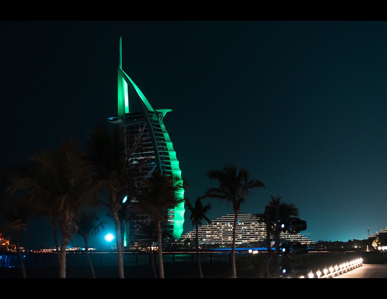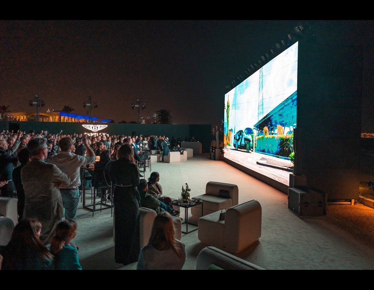Guests were welcomed to the gardens of the former royal palace of Sheikha Sanaa Bint Mana Al Maktoum on the Dubai shoreline, overlooked by the Burj Al Arab which was illuminated in Bentley green for the occasion.