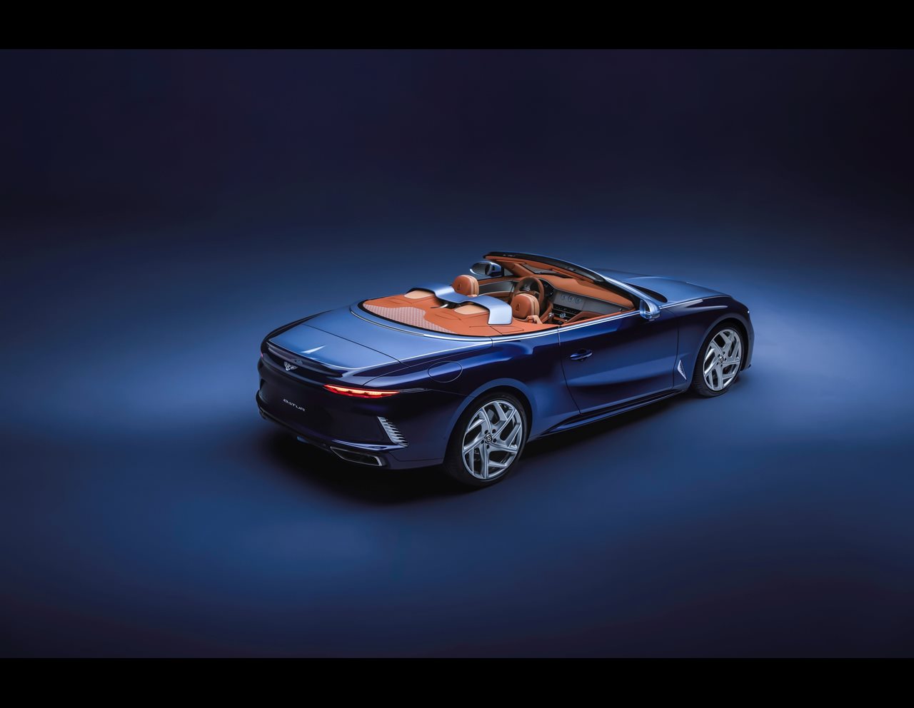 Batur Convertible #4 has a specification that leans towards a luxury aesthetic, using the client’s own commissioned colours in a tri-tone design, including a 6 mm gloss-silver fine line emphasising the Batur’s ‘endless bonnet’ design. The upper colour of ‘Breslow Blue’ has been colour-matched for the roof canvas, delivering the first bespoke coloured roof which, when stowed, reveals the matching Airbridge in the same exquisite colour. Exterior detailing continues with a ‘Midnight Breslow Blue’ bonnet pinstripe matching the lower exterior paint, accent colours to the wheels and wing mirrors, and finished with polished titanium exhaust finishers and bright silver grilles.